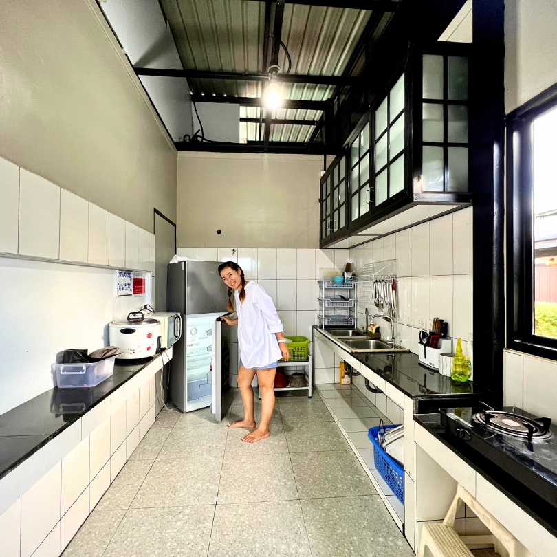 👨🍳 ครัวครบครัน พร้อมอุปกรณ์: ตู้เย็น, หม้อหุงข้าว, เตาแก๊ส, หม้อ, กระทะ, จาน, ชาม, ช้อน, ส้อม, แก้วน้ำ, กระติกน้ำแข็ง