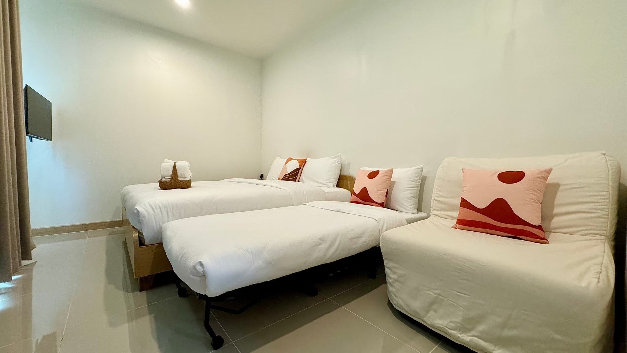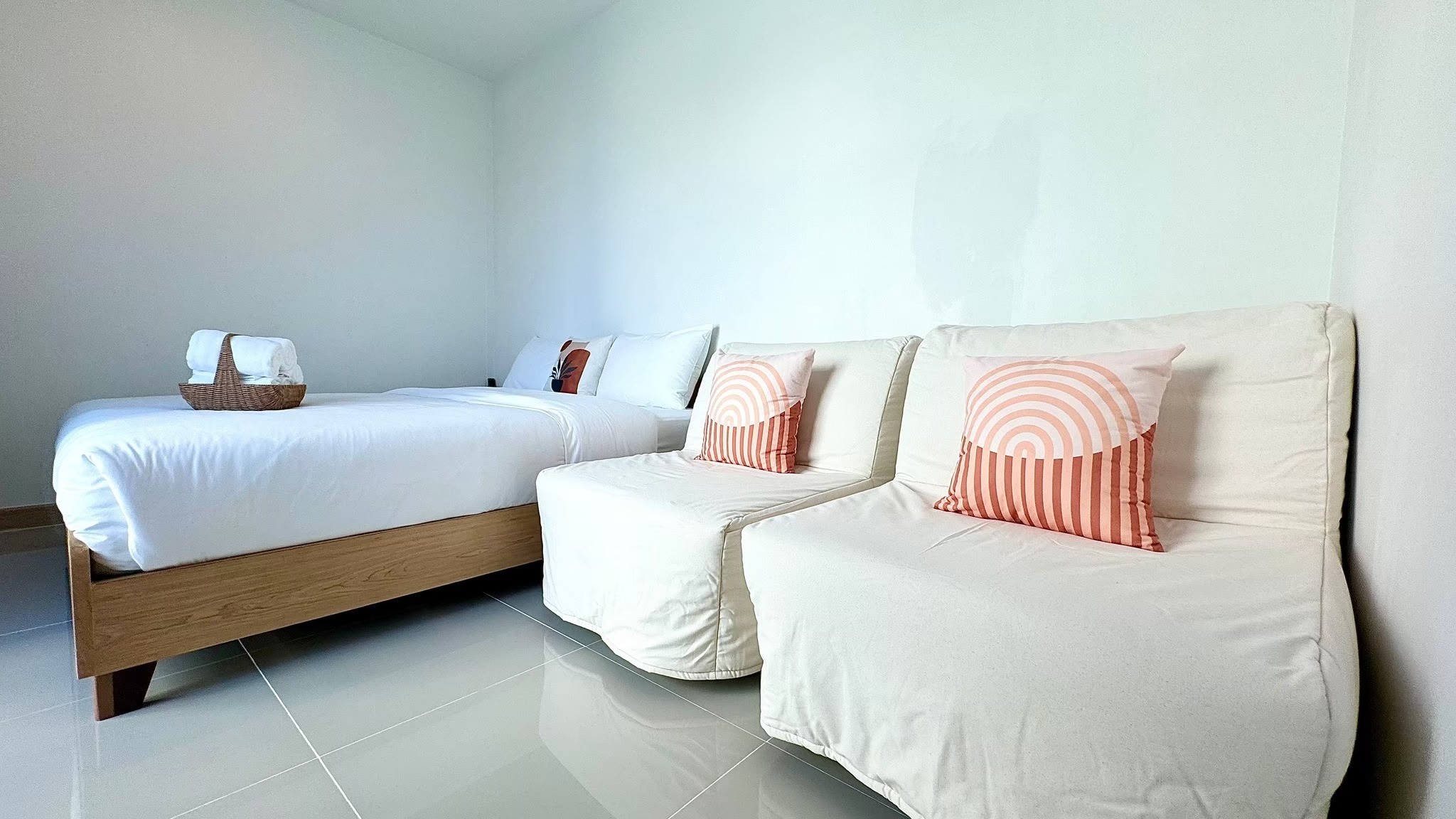 (กรณีนอนห้องละ2 ท่าน) เตียงเสริมจะปรับเป็นโซฟาแบบนั่งเดี่ยว 2 ตัว)